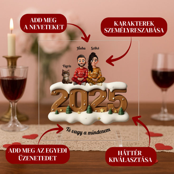 Igen, teljes mértékben személyre szabható: választhatsz figurákat, neveket, idézetet, évszámot és akár házi kedvencet is.