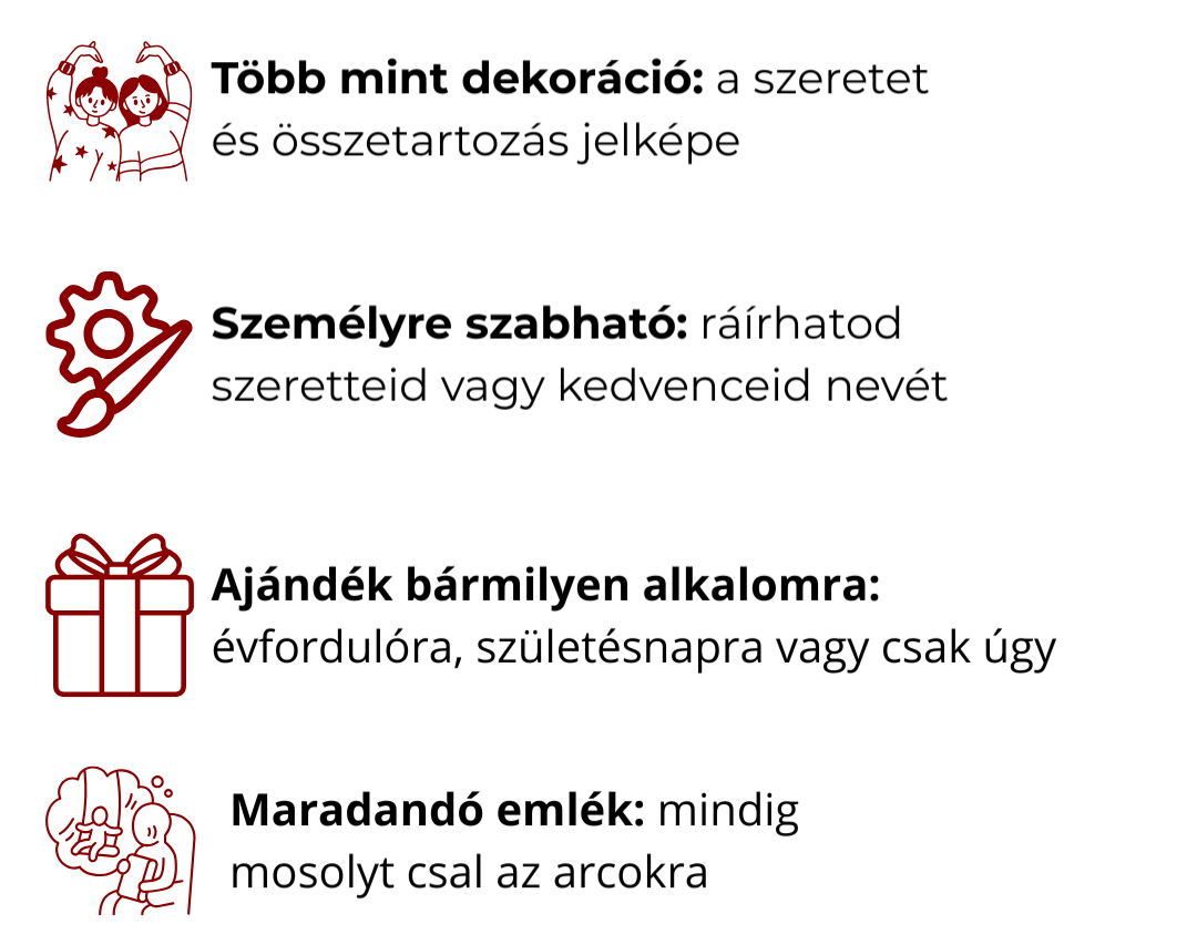 Személyre szabható, mint az emlékeid legyen szó nevekről, dátumról vagy egy kedves üzenetről, ez az ajándék a Te történeted részévé válik.